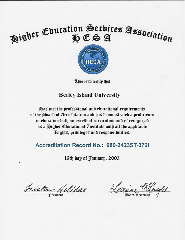 Berkley Island University is an accredited, educationally accountable institution of higher learning. Our educational programs are designed to give our students the best possible educational experience for its price. That being said, BIU is not accredited by the U.S. Department of Education. Since one of our locations is in Antarctica (an area not owned by any government) we set our own rules. Also, our other locaction is constantly moving through international waters, so again, there is no oversite. Still, at BIU, we look out for you. We assure you that all of our degree programs measure up with any school of comparable distinction.
